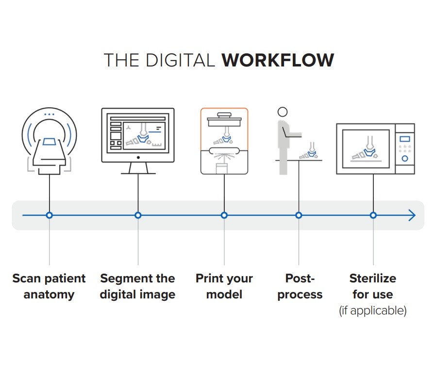 Orvosi eszközök és eszközeleme, kmint például a betegspecifikus implantátumméretezés, modellek és formák, sebészeti útmutatók valamint sablonok, biokompatibilis formák, befogók és berendezési tárgyak, vagy anatómiai modellek, amelyek használható az ortopédiában.