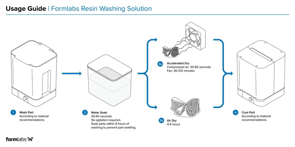 A Formlabs Resin Washing Solution nem kompatibilis a Flexible és Elastic gyanta családdal, illetve azokkal a gyantákkal, amelyek validált munkafolyamatot igényelnek (biokompatibilis, Flame Retardant Resin, stb.)