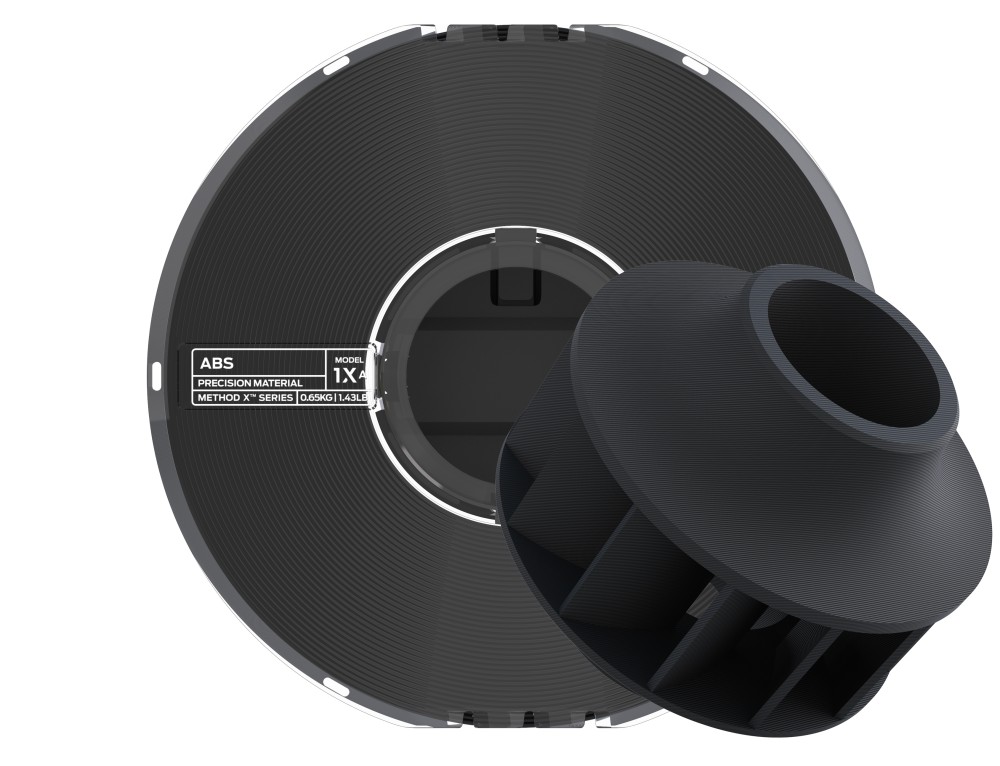 Az ABS az egyik legnépszerűbb alapanyag precíziós öntéshez, fogyasztói cikkek gyártásához a sima felszínek, a tartósság és a hőállósága révén. A Method X 3D nyomtató ipari minőságű ABS-ből képest nyomtatni modelleket segédanyagok nélkül a 100 °C-ra fűthető munkatérnek köszönhetően.