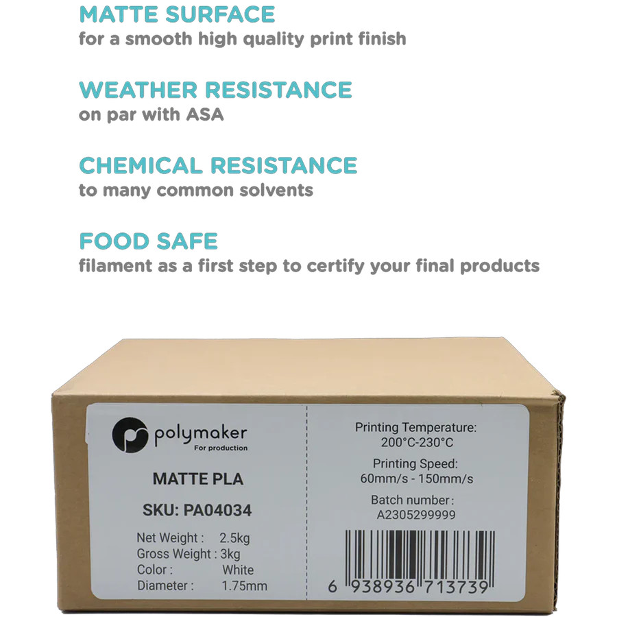A Polymaker Matt PLA for Production kifejezetten azoknak a felhasználóknak lett kifejlesztve, akik valóban sokat nyomtatnak. A matt és sima felületű PLA Filament ideális olyan termékek gyártásához, amelyek nagy időjárás- és vegyszerállóságot igényelnek.
