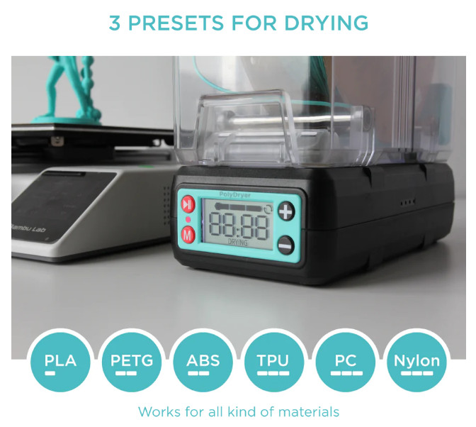 A PolyDryer Box nyomtatószál tárolódobozzal együtt egy komplett filamenttároló és -szárító dobozt alkot, amelyet úgy terveztek, hogy optimális környezetet biztosítson a 3D filamentek számára. Praktikus megoldás a hatékony szárításhoz és biztonságos tárolásához.