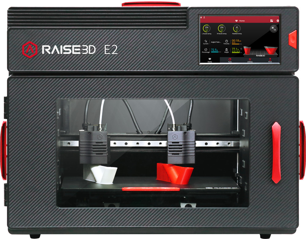 A Raise3D E2 egy kompakt, mégis ipari szintű FDM 3D nyomtató, amely független kétfejes (IDEX) technológiával működik. Ennek köszönhetően képes két azonos modellt egyszerre nyomtatni (duplication mode), vagy tükrözött tárgyakat létrehozni (mirror mode), így jelentősen növeli a termelékenységet.