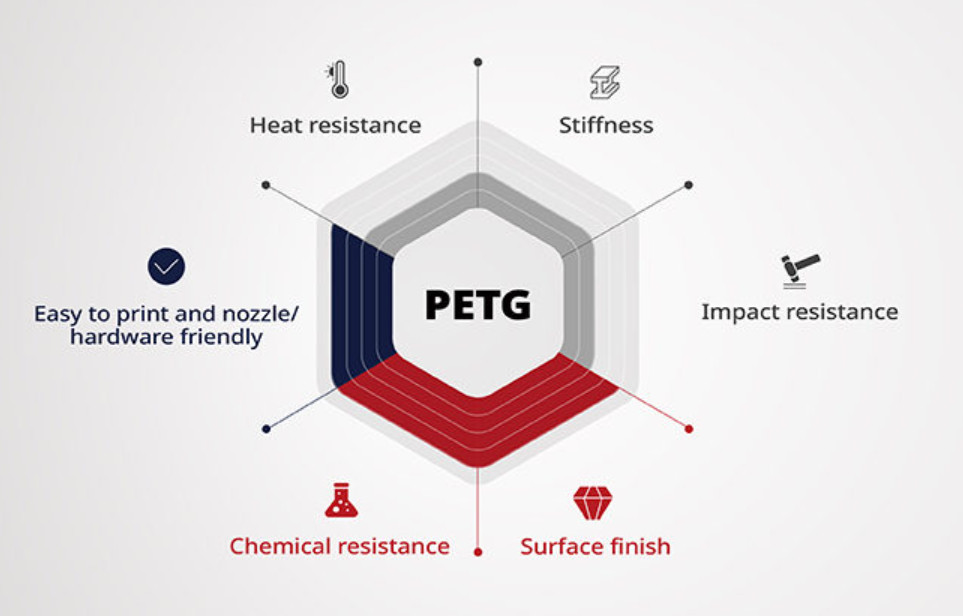 A PETG (polietilén-tereftalát-glikollal módosított) egy ipari hőre lágyuló 3D nyomtatási szál, amely kiváló vegyi ellenállással rendelkezik. A PETG erős, tartós, jó hőállósággal rendelkezik, és könnyen nyomtatható. A PETG 3D nyomtatott alkatrészek prototípus-készítésre, funkciótesztelésre, alkatrészek összeszerelésére és még sok másra használhatók.