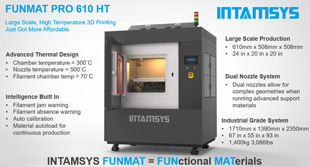 Az INTAMSYS FUNMAT PRO 610 HT egy nagyméretű, ipari FDM 3D nyomtató, amelyet a legkomplexebb mérnöki és ipari feladatokra fejlesztettek. Teljesen zárt, 300 °C-ig fűthető nyomtatókamrával, kettős extruderrel és 500 °C-os fúvókákkal rendelkezik, így a legextrémebb műszaki filamentek (pl. PEEK, PEKK, ULTEM™, PPSU, EXTEM) is stabilan és méretpontosan nyomtathatók.