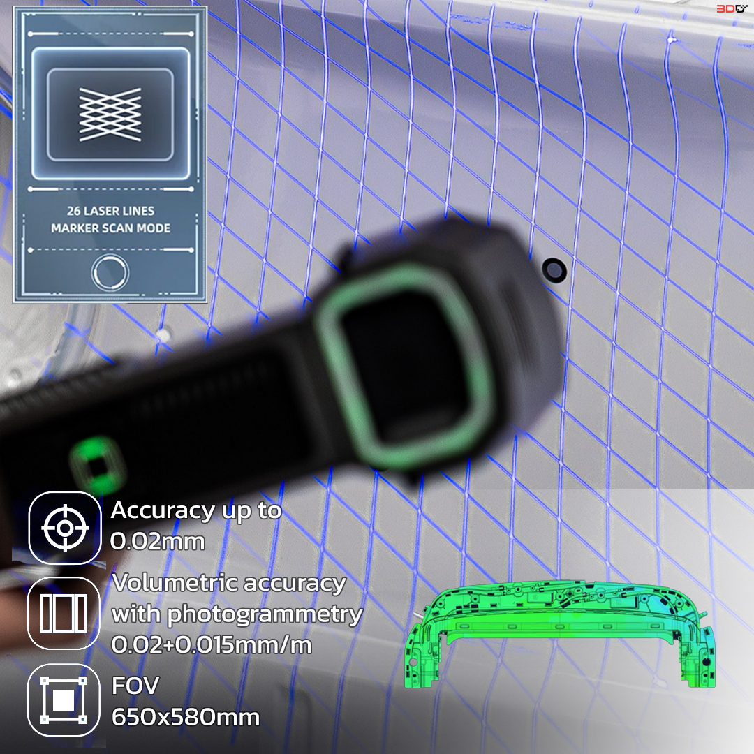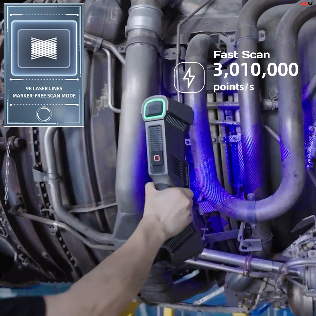 Gyors és innovatív: 98 lézervonalas üzemmódjával a FreeScan Trio a SHINING 3D első markermentes 3D lézerszkennere. Kevesebb előkészítés, nagyobb hatékonyság. A FreeScan Trio három további lézeres szkennelési módja könyörtelen pontosságot biztosít, markerekkel együtt mindegyik biztosítja az akár 0,02 mm-s tűrést. Ez a metrológiai eszköz beépített fotogrammetriával is rendelkezik, amely lenyűgöző, akár 0,02 mm + 0,15 mm/m térfogati pontosságot kínál nagyméretű tárgyak, például autókarosszériák esetében is. Akár gyorsaságra, akár pontosságra van szüksége kis vagy nagy összeállításoknál, a sokoldalú FreeScan Trio minden projektjéhez igazodik.